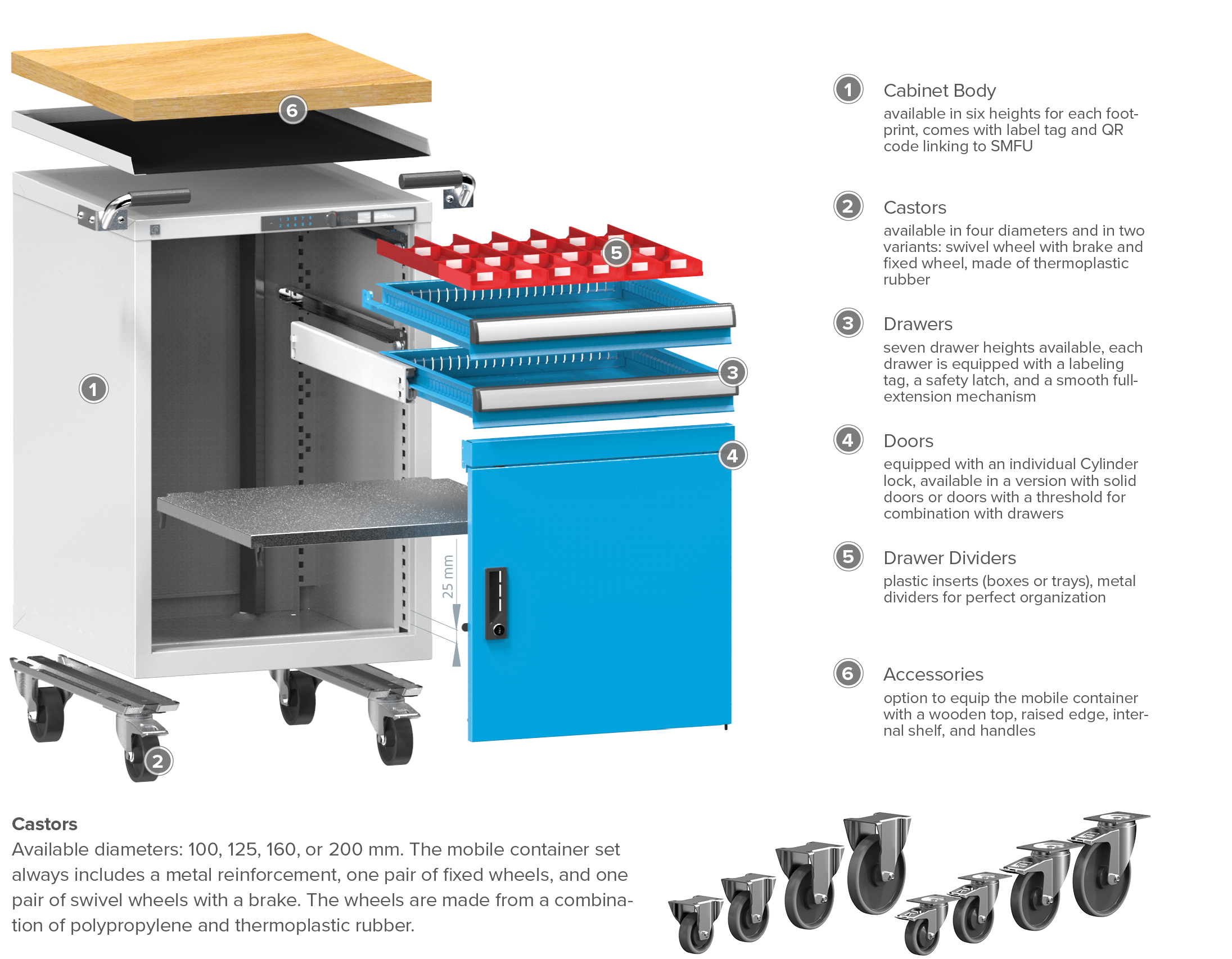 Izbrane serije predalnikov so na voljo v različici MOBILNI KONTEJNERJI. Ohišja so sestavljena iz varjenega sklopa posameznih konstrukcijskih delov iz visokokakovostnih jeklenih plošč. Notranja konstrukcija ohišij je perforirana za 25 mm. Ta perforacija se uporablja za pritrditev vodil predalov, njihovo postavitev po višini in za konfiguracijo želenega sestava predalov. Prestavitev vodil ali kavljev polic je preprosta in zelo hitra brez uporabe orodja.
