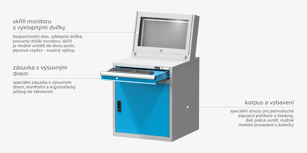 Računalniške omare se od terminala razlikujejo po spodnji omari, ki je opremljena s predalom za tipkovnico z izvlečnim dnom. Računalniške omare so na voljo tudi v mobilni različici s koleščki. Izdelek uporablja sistem enega ključa.