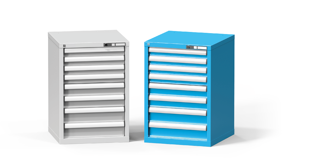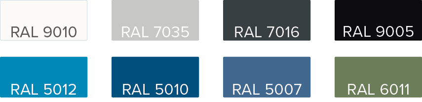 Za paleto pohištva za delavnice velja standardna barvna shema RAL 7035 za nekombinirane izdelke (npr. noge miz). Za kombinirane izdelke velja RAL 7035/5012 (npr. korpus/črtala/vrata). Ta barvna shema se uporablja, če v naročilu ni navedena zahtevana barvna shema.